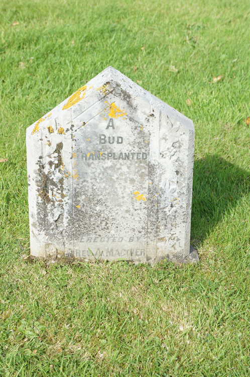 Gravestone inscription: A bud transplanted Erected by Rev. A. MacIver