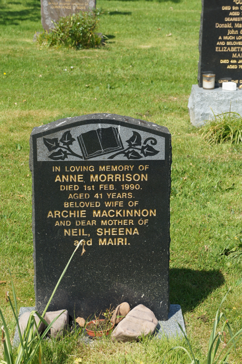 She was a daughter of Neil Morrison, Kenmore. She lived in Ardubh with Peggy MacDonald, her aunt, to go to Applecross School for her last years at primary school level. Her sister Cathy Johnston lives in Kenmore. Anne was a nurse.