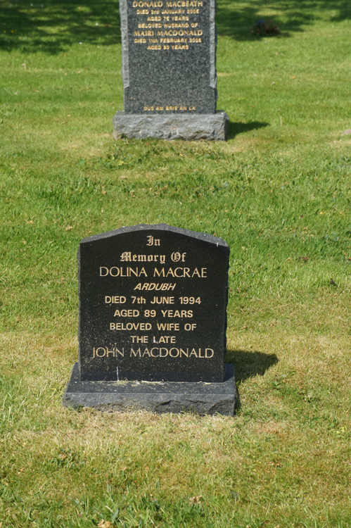 Biography: Dollie married John MacDonald, or ‘Ain Dungain, in 1954 – he wa a widower then, his wife having died in 1937 or thereabouts. She moved into ‘Ain Dungain’s house. John MacDonald is buried in the old cemetery with his first wife. Dollie’s father was John MacRae (‘Ain Dearaig); her mother was Ann Gillies. Dollie spent her time looking after her parents until they died, and then her mother’s brothers and sisters.